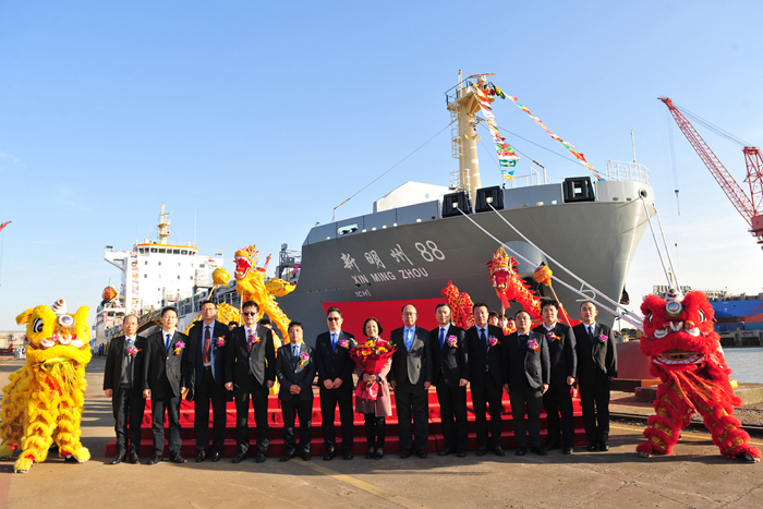 命名儀式在我集團新?lián)P子造船碼頭舉行。浙江省海港集團、寧波舟山港集團黨委委員、董事,寧波舟山港股份有限公司黨委書記、總經(jīng)理、董事宮黎明先生;寧波舟山港股份有限公司黨委委員、副總經(jīng)理任小波先生;寧波遠洋運輸股份有限公司黨委書記、董事長徐宗權先生;寧波遠洋運輸股份有限公司總經(jīng)理、黨委副書記陳曉峰先生;命名人余亞萍女士;上海雙希海事發(fā)展有限公司副總經(jīng)理奚金先生;中國船級社(CCS)駐我司項目現(xiàn)場辦以及我集團副總經(jīng)理杜成忠先生、副總經(jīng)理張濤先生、總經(jīng)理助理吉宏飛先生等相關領導和嘉賓出席了儀式。命名人余亞萍女士將新船命名為“新明州88”輪并為新船砍纜祈福。