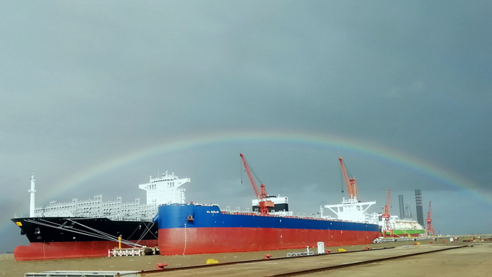 8月4日,一道彩虹不偏不倚地罩在了——??吭谖壹瘓F太倉碼頭的兩艘待交付的新船上。風雨后的這道彩虹,像是對辛勤勞作的造船人的褒獎。