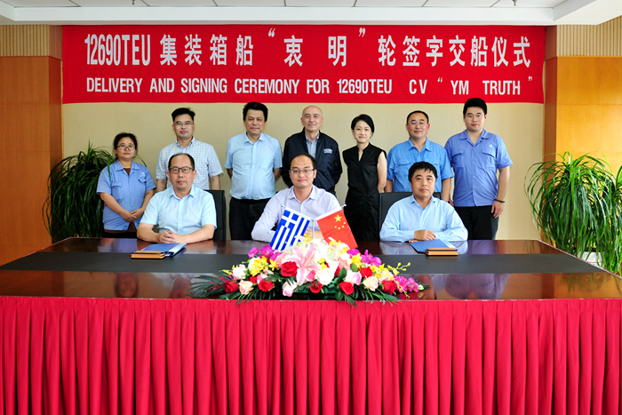 繼7月24日首船交付后,8月7日,我集團為希臘船東COSTAMARE建造的第二艘12690TEU集裝箱船“YM TRUTH”輪,順利交付。交銀租賃公司航運租賃部總輪機長梁苗先生、航運租賃部高級經(jīng)理徐鑫先生,監(jiān)造公司W(wǎng)atermark運營總監(jiān)Mr.Panos Christidis,船東律師張琳女士,以及我集團副總經(jīng)理杜成忠先生、張濤先生、我集團新?lián)P子造船副總經(jīng)理吉宏飛先生等領導和相關(guān)工作人員共同見證了新船交付。