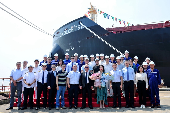 命名人蔡曄斐女士剪斷香檳繩、敲擊香檳,將新船命名為“OKOLCHITSA”輪。她對(duì)建造該船以及為確保該船順利交付所努力付出的所有人,表示了誠(chéng)摯的感謝。命名人蔡曄斐女士與嘉賓共同登船參觀并鳴響汽笛,祝福新船以及船上的海員們?cè)谖磥?lái)的航行中一帆風(fēng)順,貨如輪轉(zhuǎn),為船東帶來(lái)財(cái)富。