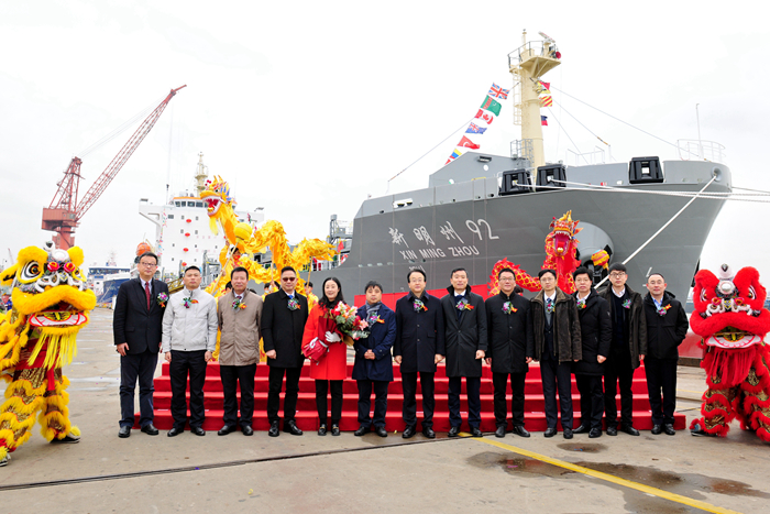 新船命名儀式于2月18日在我集團新?lián)P子造船碼頭舉行。浙江省海港集團、寧波舟山港集團總經(jīng)理、黨委副書記、董事陶成波先生;寧波遠洋運輸股份有限公司黨委書記、董事長徐宗權先生;寧波遠洋運輸股份有限公司黨委副書記、總經(jīng)理陳曉峰先生;命名人勵平女士;上海雙希海事發(fā)展有限公司總經(jīng)理沈濱先生;中國船級社(CCS)江陰辦事處副主任王宏斌先生,以及我集團副總經(jīng)理杜成忠先生、副總經(jīng)理周科偉先生、總經(jīng)理助理吉宏飛先生等相關領導和嘉賓出席了儀式。勵平女士將新船命名為“新明州92”輪,為新船砍纜祈福。