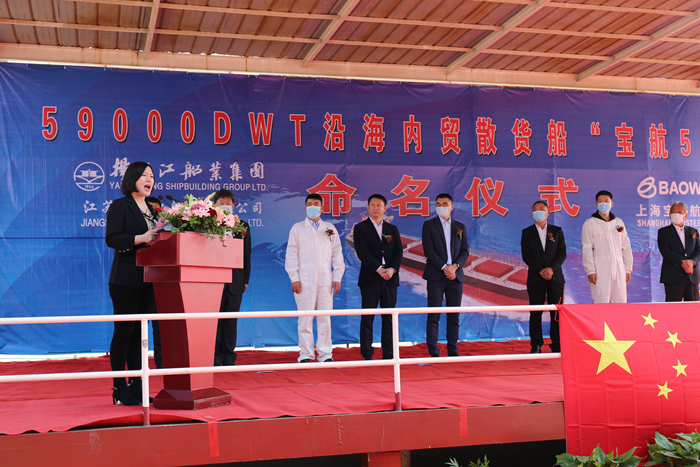 4月8日上午8點(diǎn)58分,教母陳照娣女士、寶鋼航運(yùn)船舶技術(shù)部經(jīng)理秦榮玉先生、船舶技術(shù)部機(jī)務(wù)主管董彬先生、中國船級社驗船師麻天一先生、上海雙希海事發(fā)展有限公司船舶監(jiān)理部總監(jiān)孔正先生及監(jiān)造組、揚(yáng)子江集團(tuán)副總經(jīng)理宋書明先生及其他公司領(lǐng)導(dǎo)參加了命名儀式。教母陳照娣女士為本船命名,并為新船砍纜祈福。“寶航56“輪是我集團(tuán)為上海寶鋼航運(yùn)有限公司建造的首制船,建造過程中船東、船級社、監(jiān)造組及船廠等多方團(tuán)結(jié)一心,克服了限電、新冠疫情等困難,僅用9個月即高品質(zhì)地完成了本船建造,充分體現(xiàn)了揚(yáng)子江速度。