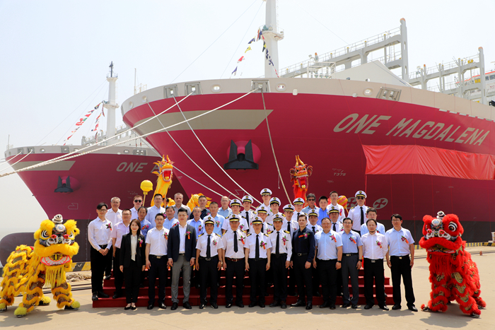 6月17日上午,“ONEPARANA”輪與同批次建造的“ONE MAGDALENA”輪同日在太倉(cāng)進(jìn)行了命名。命名人錢(qián)佳寧女士、王丹女士;SEASPAN公司高級(jí)副總裁李堃先生、資產(chǎn)部副總裁 J.J.邁耶先生、項(xiàng)目經(jīng)理蘇小華先生、新造船現(xiàn)場(chǎng)辦經(jīng)理南相福先生;LR船級(jí)社中部區(qū)總經(jīng)理李毅先生;以及揚(yáng)子鑫福造船總經(jīng)理?xiàng)钛┫壬偨?jīng)理助理劉銀君先生;中國(guó)信保江蘇分公司項(xiàng)目險(xiǎn)業(yè)務(wù)處交通運(yùn)輸科負(fù)責(zé)人童道平先生等領(lǐng)導(dǎo)和嘉賓出席了命名儀式。