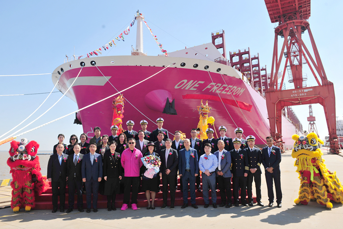 10月10日,新船命名儀式在船廠碼頭隆重舉行。浦銀租賃副總裁陳香女士,SEASPAN公司全球高級副總裁李堃先生,ABS船級社華中地區(qū)運(yùn)營總經(jīng)理宋愛民先生,中船七〇八所所長助理朱建璋先生,DNV船級社高級副總裁黃今先生,浙能越海公司副總經(jīng)理徐慧平先生,以及我集團(tuán)董事長兼總經(jīng)理任樂天先生,副總經(jīng)理周科偉先生,總經(jīng)理助理吉宏飛先生等領(lǐng)導(dǎo)和嘉賓共同出席了命名儀式。陳香女士將新船命名為“ONE FREEDOM”輪,為新船砍纜并擲香檳禮,拉響汽笛,祝福新船航行平安,載譽(yù)全球,為船東和租家?guī)順s譽(yù)和財(cái)富。