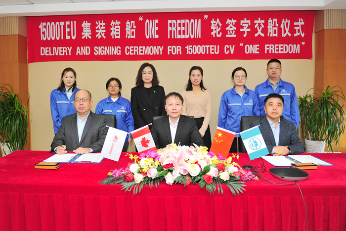 10月11日,船東SEASPAN公司項(xiàng)目經(jīng)理蘇小華先生,我集團(tuán)副總經(jīng)理杜成忠先生、集團(tuán)副總經(jīng)理張濤先生分別代表各方簽署交船文件。