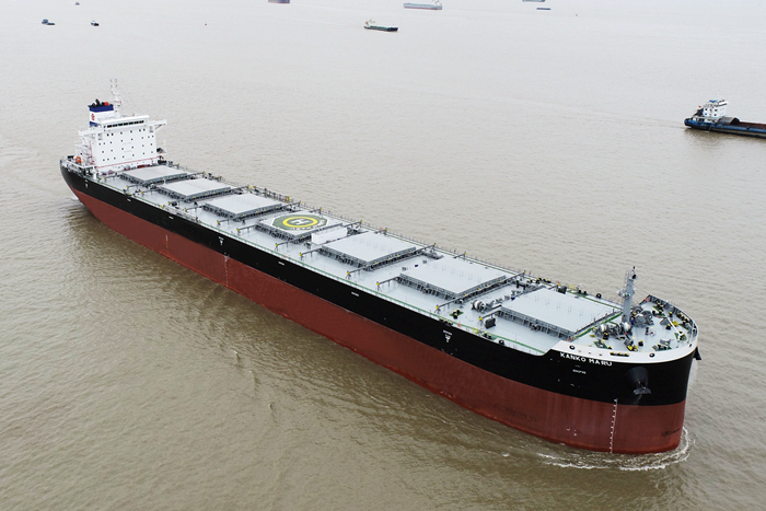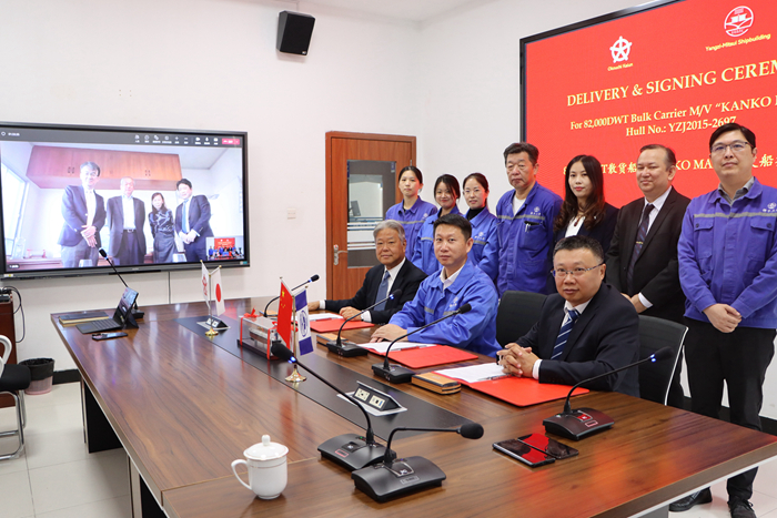 10月26日上午,揚(yáng)子三井造船為日本船東建造的82000DWT散貨船“KANKO MARU”輪順利交付。船東社長(zhǎng)Keisuke Okouchi先生,我集團(tuán)副總經(jīng)理兼揚(yáng)子三井總經(jīng)理宋書明先生、揚(yáng)子三井COO田村光路先生、CFO根橋秀州先生、副總經(jīng)理陳國(guó)強(qiáng)先生等代表出席視頻交船儀式。