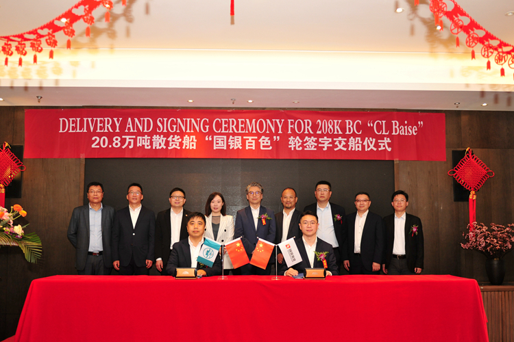 ▲當日,在各方代表的共同見證下,國銀租賃船舶事業(yè)部副總經(jīng)理劉玉貫先生,我集團副總經(jīng)理杜成忠先生,分別代表雙方簽署交船文件。4月24日,“CL BAISE”輪離開船廠碼頭,開啟首航。