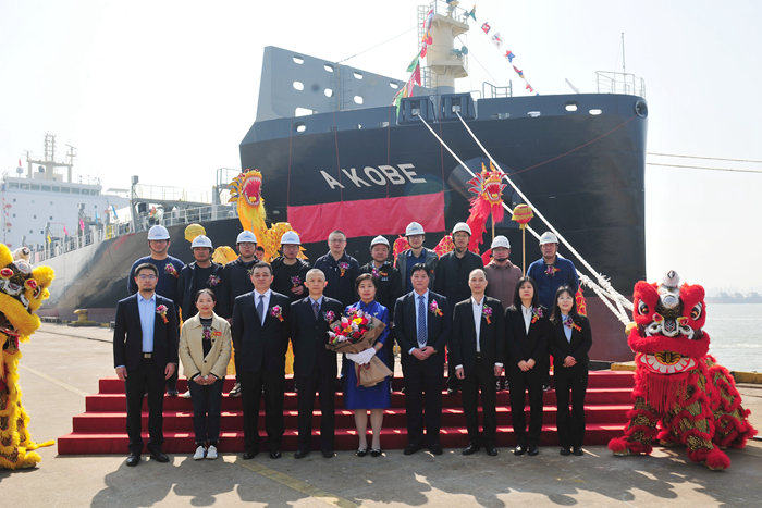 賈軍玲女士將新船命名為“A KOBE”(神戶)輪,并為新船砍纜、擲香檳禮。在“A KOBE”(神戶)輪首任船長的引導帶領下,嘉賓登船參觀新船。新船命名人賈軍玲女士拉響啟航汽笛,她祝福新船乘風破浪,通江達海,開辟遠航新篇章。祝愿隨船船員永遠一帆風順,為船東和各方帶來繁榮和財富。