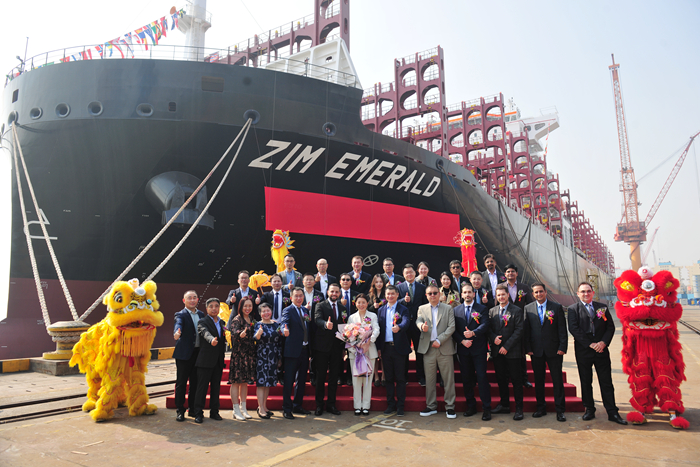 Cindy Li 女士將N1371船命名為“ZIM EMERALD”輪。嘉賓們共同與新船合影留念,祝福新船在未來的每一次航程中,順風(fēng)順?biāo)?,為船員帶來平安,為船東和合作各方帶來財(cái)富和榮耀。