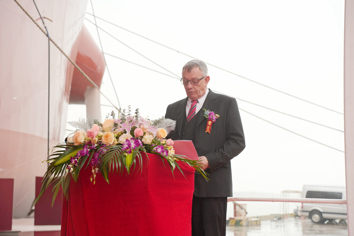 教母中信銀行蘇州分行副行長(zhǎng)倪衛(wèi)芳女士,HARTMANN董事會(huì)執(zhí)行總監(jiān)Ulrich Adami先生、董事會(huì)商務(wù)總監(jiān)Jan-Lars Kruse先生、新造船經(jīng)理Ionut Cornea先生、大中華區(qū)區(qū)域經(jīng)理龍葉飛先生,DNV船級(jí)社江陰站經(jīng)理史勇林先生,中信銀行太倉(cāng)分行行長(zhǎng)顧衛(wèi)先生,三井物產(chǎn)上海井上伸一先生、住田直也先生、田野先生,揚(yáng)子江船業(yè)集團(tuán)副總經(jīng)理丁建文先生,集團(tuán)副總經(jīng)理兼揚(yáng)子三井總經(jīng)理宋書(shū)明先生,揚(yáng)子三井CFO石丸雄次先生、COO田村光路先生、副總經(jīng)理陳國(guó)強(qiáng)先生及總經(jīng)理助理中尾慎一先生以及各合作方、員工等代表參加了命名交船儀式。