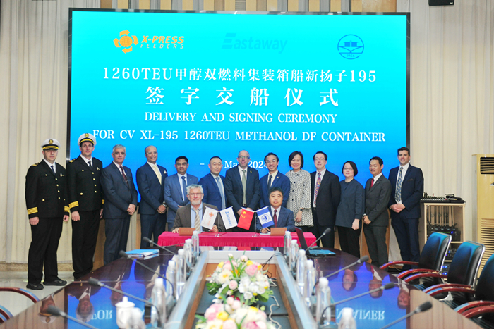 5月16日上午,我集團(tuán)新?lián)P子造船為船東新加坡 X-Press Feeders公司建造的首制1260TEU甲醇雙燃料集裝箱船簽字交付。該型甲醇雙燃料集裝箱船由中國(guó)船舶及海洋工程設(shè)計(jì)研究院(MARIC)聯(lián)合德國(guó)知名設(shè)計(jì)公司共同設(shè)計(jì)優(yōu)化,是一艘裝箱量可達(dá)1260TEU的敞口支線集裝箱船,能夠裝載4種不同尺寸的集裝箱。