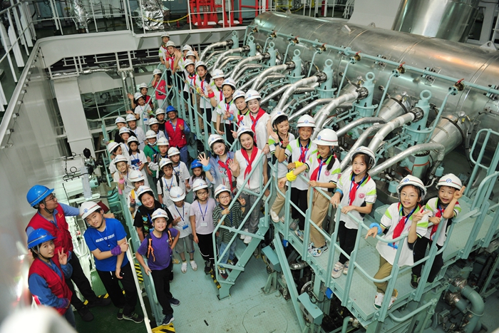 現(xiàn)場觀摩完壯觀的新船吉水儀式,“小小揚船人”對船舶產生了濃厚的興趣。為了讓孩子們更直觀地感受剛看到的這艘龐然大物的威武雄姿,公司安排他們登上建造完工的同型2600TEU集裝箱船參觀。